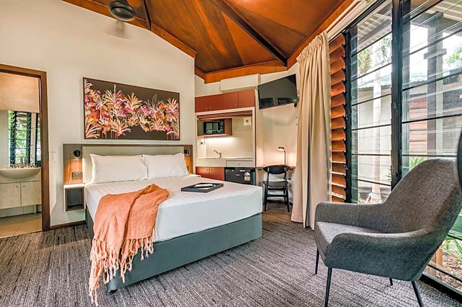 This villa is nestled within the tropical gardens of the resort with the wooden decks facing towards the Esplanade parkland. The villa features wooden decks with a table, chairs and electric BBQ. Complete with glass sliding doors and louvers they allow for true tropical living. Sheer and block out curtains provide natural light during the day and privacy when required.